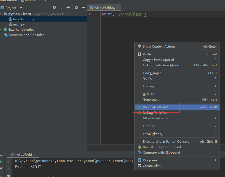 通過右擊 Run 'helloWorld',來執(zhí)行python文件??刂婆_(tái)輸出運(yùn)行結(jié)果。